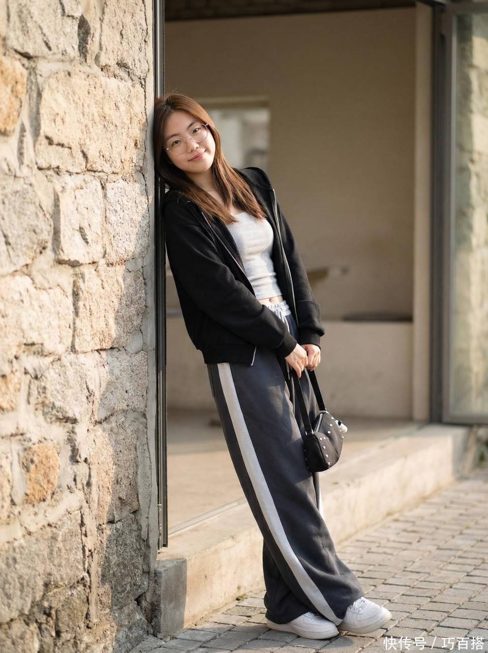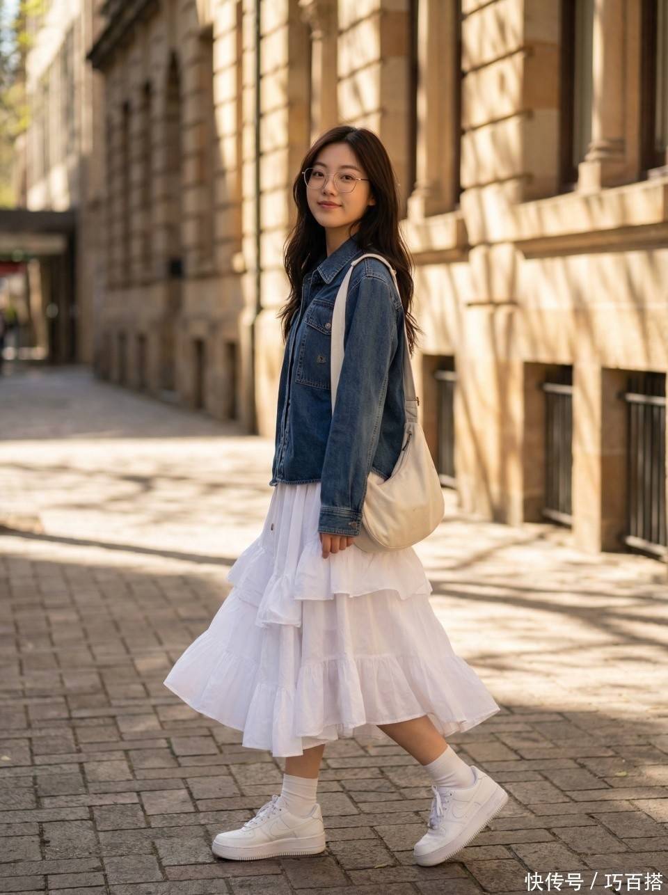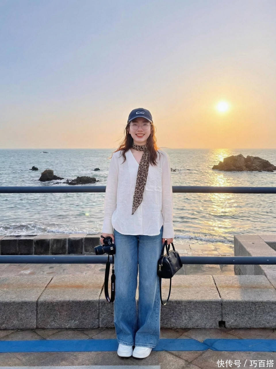 但丝巾的氛围和白色板鞋氛围之间存在违和,善于搭配的姐妹可以一试,穿衣追求简单大方的朋友,谨慎选择。或者直接选择像博主身上这类白色拉链或者黑色包包上带有白色珍珠配饰的颜色呼应方式,也很合适。